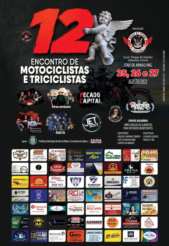 12º ENCONTRO DE MOTOCICLISTAS ANJOS DE PEDRA nos dias 25, 26 e 27 de agosto no Parque de Exposição. Com arrecadação de alimentos para entidades.