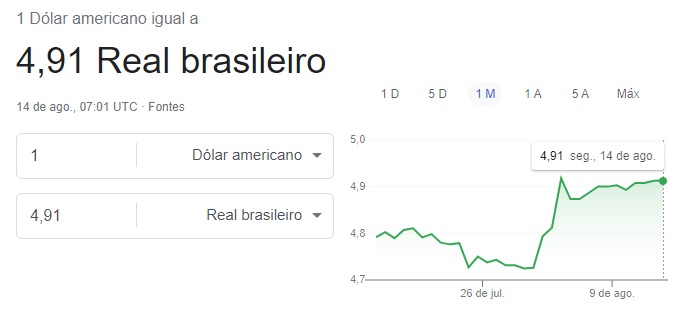 Valor mais baixo em 31 de julho R$4,73. Valor mais alto em 3 agosto R$4,79. Valor em 14 de agosto R$4,91