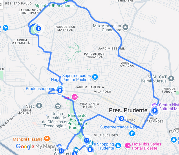 O roteiro tem início na Unoeste no Bairro Bongiovani, segue pelo Parque do Povo na Quadra e Pista de Skate, passa pelo Prudenshoping no Jardim Eldorado, vai até ao Prudentão no Bairro Maracanã próximo ao Novo Bongiovani, segue no Centro Cultural Matarazzo na Vila Marcondes um dos bairro mais antigos da cidade onde nasceu Prudente próximo ao Centro na Catedral e finaliza na Cidade Universitária no Hospital Regional.