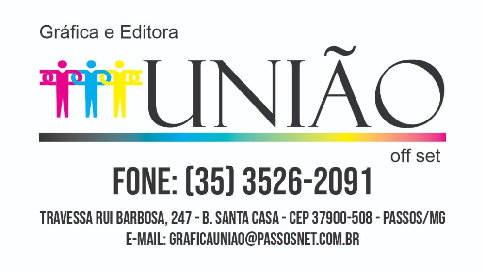 Impressos com Qualidade: offset, adesivos, banner, blocos, calendários, cartões, convites, envelopes, boletos, imas e muito mais! Gráfica e Editora União Offset Travessa Rui Barbosa, 247 Telefone: 3526-2091 WhatsAPP: 35 9.9961-0540 em Passos Gráfica União – Editora e Offset