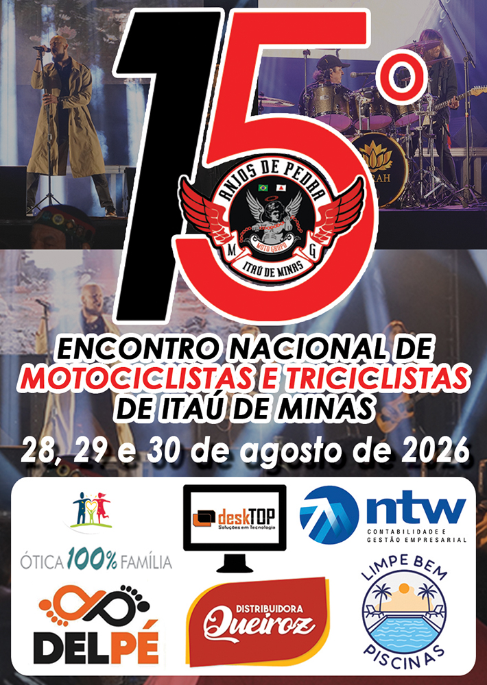 🏍🔥 Vem aí o 15º Encontro Nacional de Motociclistas e Triciclistas de Itaú de Minas! 🤘🇧🇷 📅 28, 29 e 30 de agosto de 2026 📍 Itaú de Minas – MG Organização: Moto Clube Anjos de Pedra ⚡️ Bora rodar!