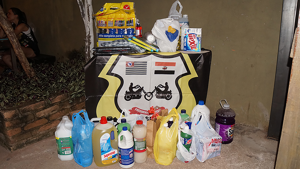 O compromisso social também é parte da identidade do 100 Fronteiras MC. O moto clube realiza e apoia campanhas de arrecadação de alimentos e iniciativas beneficentes, utilizando a força do motociclismo para contribuir com projetos e pessoas. Neste dia realizaram coleta de produtos de limpeza para a Igreja Ministério Restitui. Aperte para ampliar as fotos: